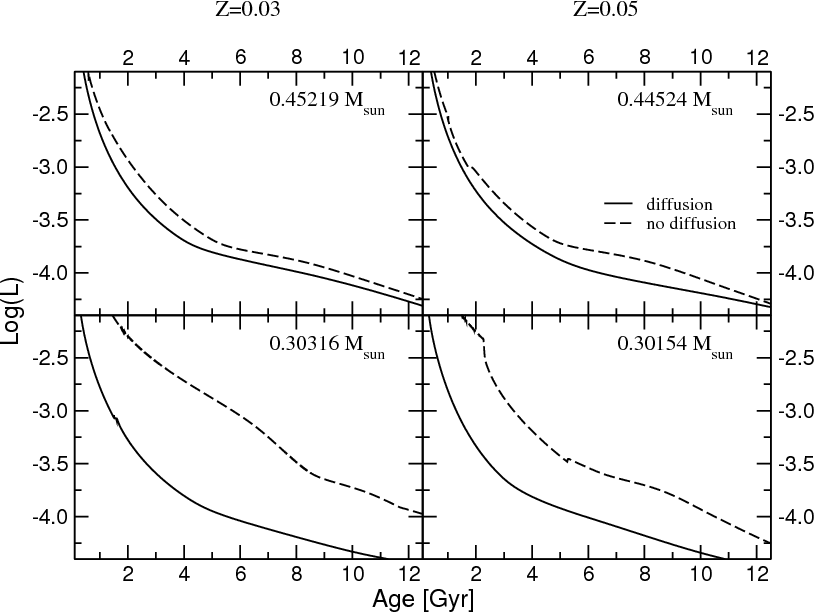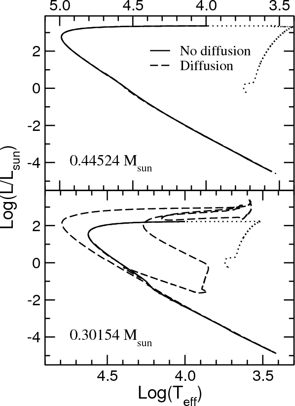 with a Z=0.03 progenitor. The solid line shows the case in which diffusion