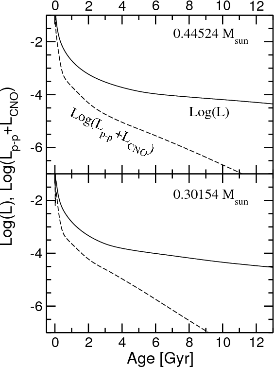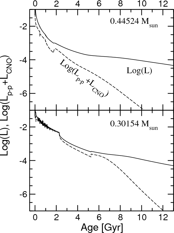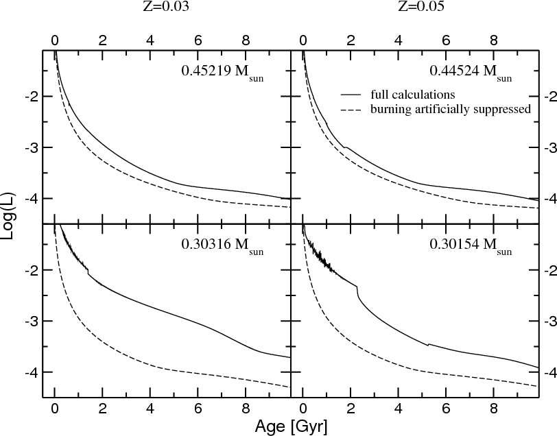 More recently, Nelson et al. (2004) have also found that hydrogen burning strongly delays the cooling process, especially for very low-mass white dwarfs. They found flashes taking place for masses in the range
