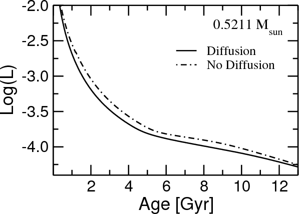 is considered, while the dashed line illustrates the case in which diffusion is neglected. Following the trend we find for the case of the more massive He-core white dwarfs discussed previously, it is clear that the age of massive He-core white dwarfs is not markedly