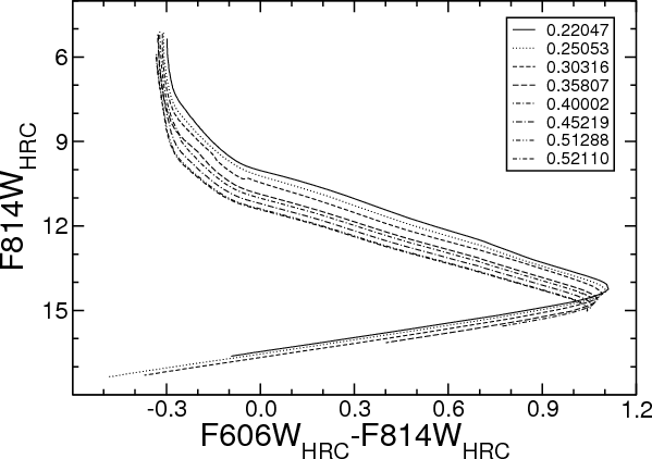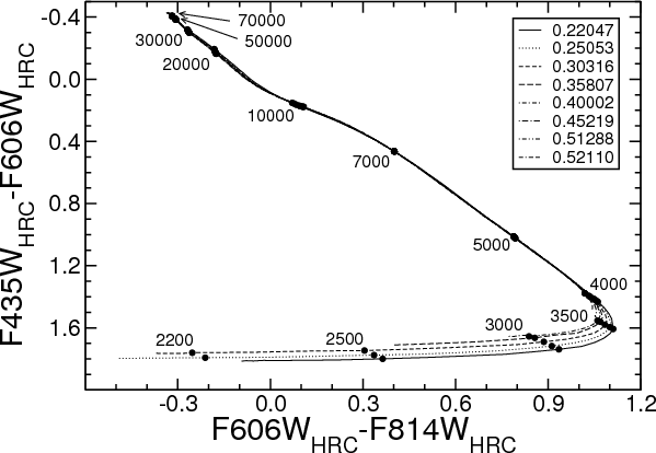 Figure 10: F814W, F606W- F814W color-magnitude diagram for our He-core white dwarf sequences with Z=0.03 progenitors. Pure hydrogen composition is assumed. |