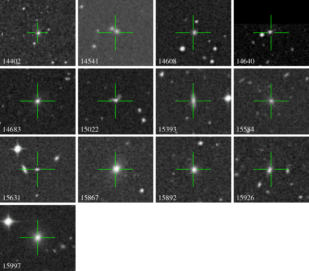 Figure 1: Optical (R) images of the normal galaxy candidates, centred on the X-ray position. The inner radii of the crosses are 6 arcsec and the outer 30 arcsec. |