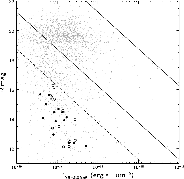R-band magnitude versus X-ray flux for emission and absorption line galaxies in our sample, marked with filled and open circles respectively. Open triangles mark sources with featureless spectra. Solid lines represent