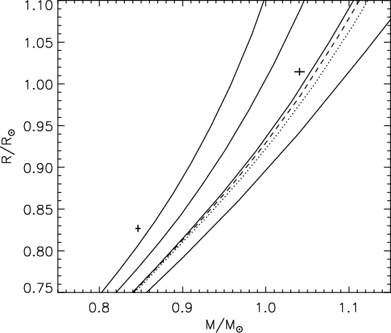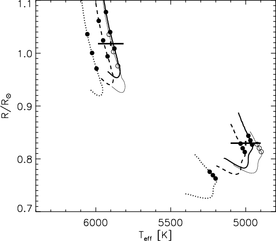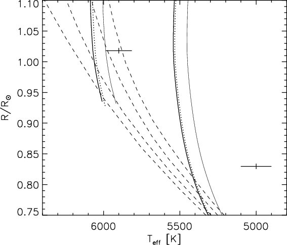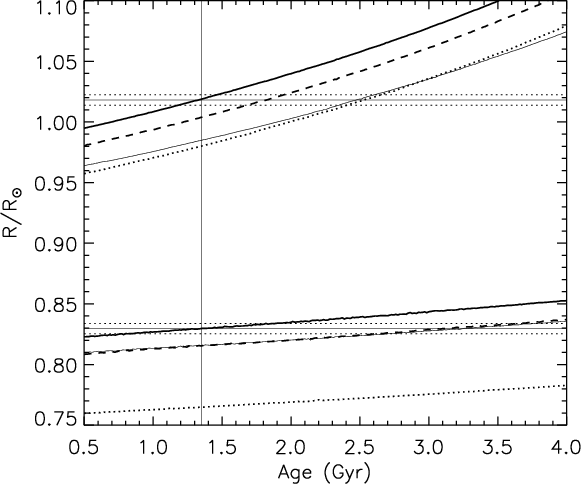 As pointed out by e.g. Hoxie (1973), Popper (1997), Clausen et al. (1999), Torres & Ribas (2002), Ribas (2003), Dawson & De Robertis (2004), and López-Morales & Ribas (2005), current stellar models, scaled to the Sun, are unable to reproduce the measured temperatures and radii for many binary components less massive the Sun. Such models tend to predict too high temperatures, and radii, which are up to 10% too small, compared to a measured accuracy of about 1% for several systems. The model luminosities seem, however, to agree fairly well with observations. Chromospheric activity has been suggested as a likely cause, and e.g. Gabriel (1969), Cox et al. (1981), Clausen et al. (1999), and Torres et al.(2006) have demonstrated that the model fits can be improved by using a reduced mixing-length parameter when calculating envelope convection. The latter authors also show that there is a link between activity and increased radii. Morales et al. (2008) find strong radius and temperature dependencies on stellar activity for both single and binary low-mass stars, and López-Morales (2007) finds correlation between activity level (X-ray emission level) and radius for faster rotating binary components, but not for slowly rotating single stars. On the theoretical side, Chabrier et al. (2007) have, via a phenomenological approach, examined the consequences on the evolution of low-mass stars and brown dwarf eclipsing binaries of a) inhibiting convection due to rotation and/or internal magnetic field, and b) the presence of surface magnetic spots.
