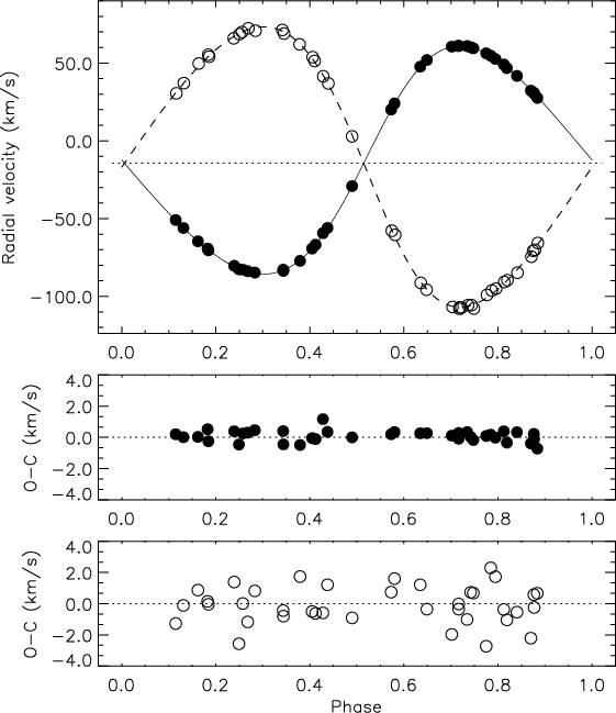 Our study is based on the first modern light curves and spectroscopic observations for V636 Cen; preliminary dimensions based on part of the data were derived by Larsen (1998). For the spectroscopic and photometric analyses of V636 Cen presented below, we have adopted the linear ephemeris by CVG08 (Eq. (4)). Throughout the paper, the component eclipsed at the deeper eclipse at phase 0.0 is referred to as the primary (p), and the other as the secondary (s) component.