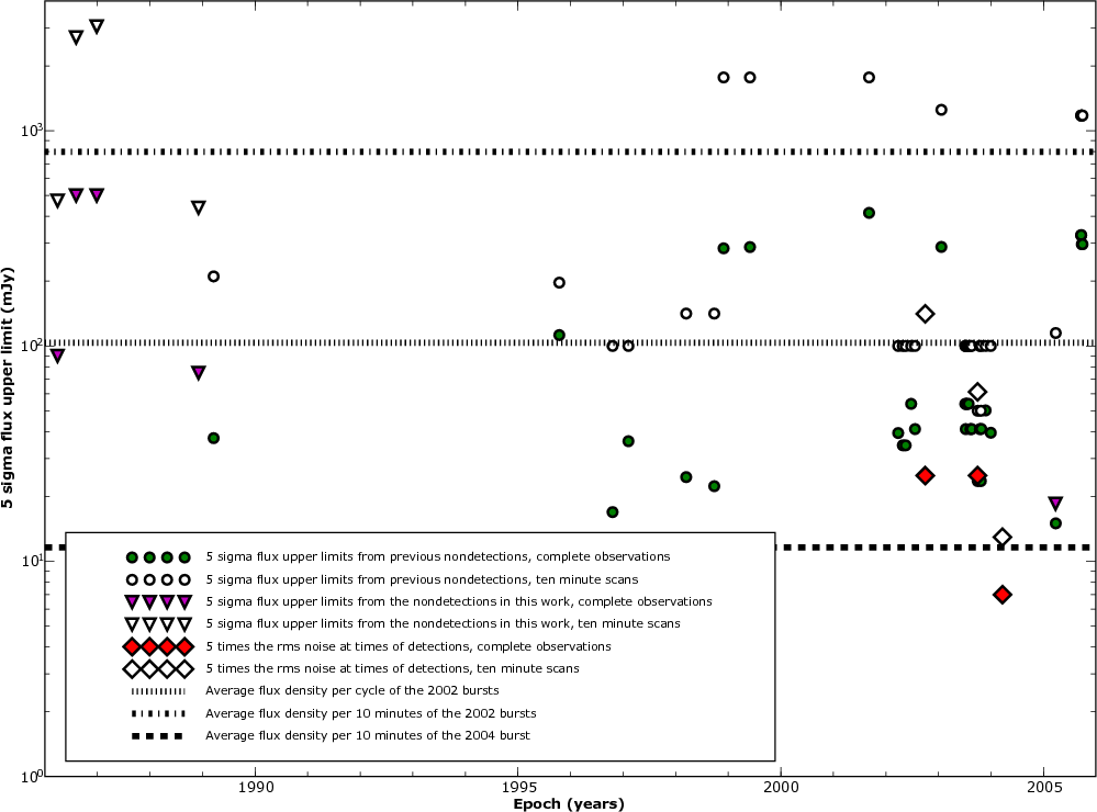 south of the Galactic Centre (Hyman et al. 2007,2006,2005) and the suggestion that this may be the prototype of a new class of particularly bright, coherently emitting radio transients have led to speculation about its nature. In particular, the 77 min recurrence of the Jy level bursts was attributed to a period of rotation (Zhang & Gil 2005), revolution (Turolla et al. 2005) and precession (Zhu & Xu 2006). A nulling pulsar and an ``X-ray quiet, radio-loud'' X-ray binary have also been suggested (Kulkarni & Phinney 2005), as well as an exoplanet and a flaring brown dwarf (Hyman et al. 2005). The discovery has led to follow-up observations and re-examination of archival data at both 92 cm and other bands. Those did not reveal a source (Hyman et al. 2006; Zhu & Xu 2006; Hyman et al. 2005), with two exceptions (Hyman et al. 2007,2006). Both of the redetections were single bursts, possibly due to the sparse sampling of these observations. The first redetection was possibly the decaying part of a bright (0.5 Jy level) burst that was detected at the first two minutes of a ten minute scan. The second redetection was a faint short (