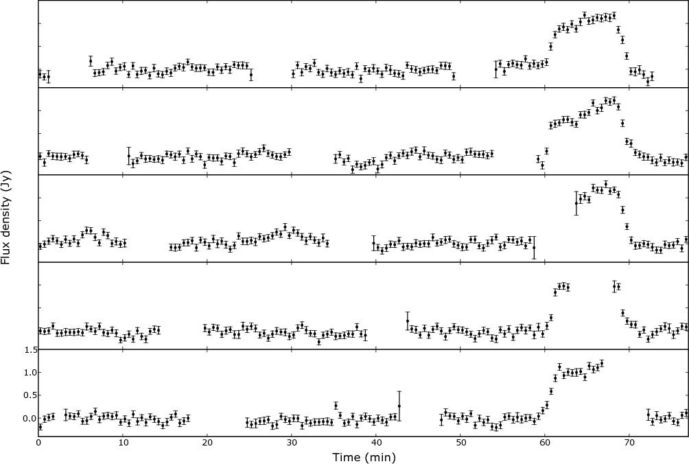 Figure 5: The plot above shows the five bursts from the discovery dataset of GCRT J1745-3009 with 30 s sampling folded at intervals of 77.012 min. Time is relative to 20h50m00s on 2002 September 30 (IAT) (plus multiples of 77.012 min). |