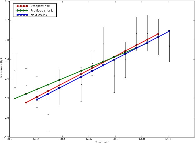 Figure 4: This plot illustrates how the times of steepest rise for four of the bursts are determined. Weighted linear regression is performed on successive one minute chunks of data. The chunks have a maximum of 55 s of overlap time. Here the rising part of the first burst is shown. |