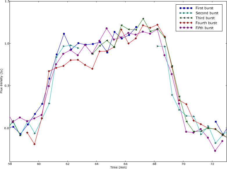 at 92 cm. Reanalysis of the discovery observation data resulted in a more accurate and more complete lightcurve. The five bursts appear to have the same shape: a steep rise, a more gradual brightening, and a steep decay. We found variations in burst duration of order