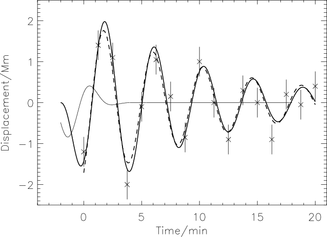 Figure 2: Comparison of the loop displacement measured in Nakariakov et al. (1999) with the oscillation described by Eq. (3) with the righthand side given by Eq. (4) (solid thick curve). The thin solid curve shows the vortex shedding driving force. The dashed thick curve shows the empirical best fitting exponentially decaying harmonic curve determined in Nakariakov et al. (1999). |