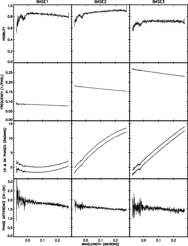 Figure 1: Characterization of a medium resolution (R=1500) P2VM with 3 telescopes in the K band. From top to bottom, as a function of the wavelength: visibility, frequency (in pixel-1), phases of the ck and dk (radians), and their difference. |