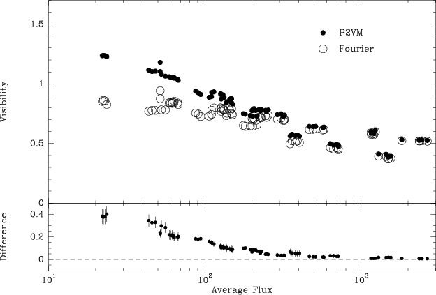 The visibilities, computed with both methods and averaged in wavelength, are represented in Fig. 2 as a function of the average flux per interferogram. For high fluxes, the two approaches provide, within the noise, the same visibilities. However, they begin to deviate from each other at fluxes below a few hundred photoevents per interferogram. Below this limit, the current implementation of the P2VM method provides visibilities systematically higher than the Fourier values, and even visibilities larger than 1 for small S/N interferograms, with a difference increasing as the flux decreases.