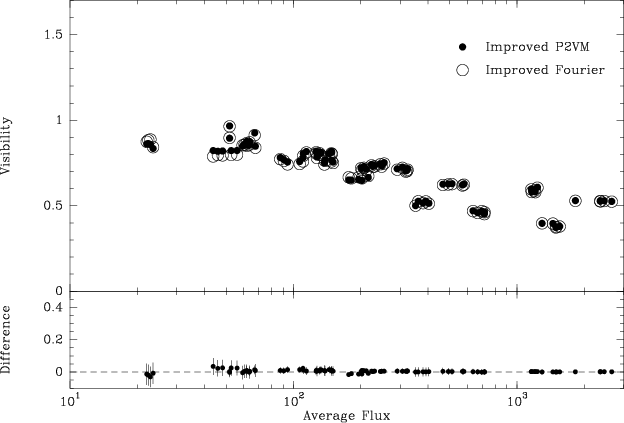 Figure 3: Top: comparison of the visibilities, averaged in wavelength, obtained with the improved P2VM method (black dots) and the improved Fourier method (circles). Bottom: visibility difference between the methods; the error bars are those of the P2VM. The two approaches now provide fully consistent results at any range of flux. |