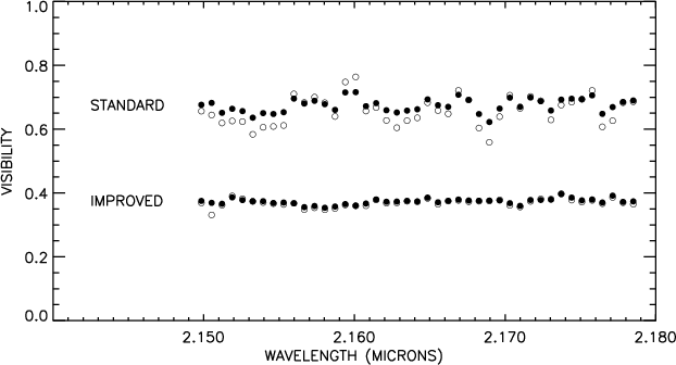 Figure 4: Top: standard P2VM (open circles) and Fourier (black dots) visibilities of a bright source as a function of wavelength. The visibilities are fully consistent, but possess large structures. Below, the visibilities (shifted down by 0.3 for clarity) derived from the improved P2VM and Fourier approaches: the structures have nearly completely been removed. |