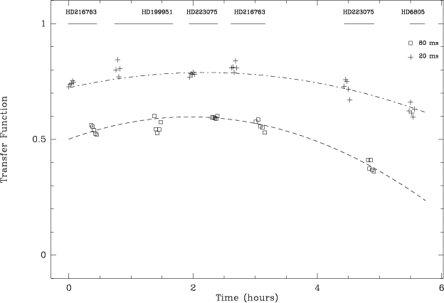 Figure 5: Transfer function of one COM4 night, obtained with the improved AMBER data reduction software, on the same dataset as in Fig. 3. The symbols differentiate the two integration times used, 20 ms and 80 ms. The dotted and dashed lines are the best second-degree polynomial that would interpolate the transfer function of the night for each integration time. |