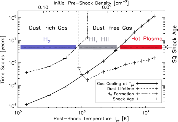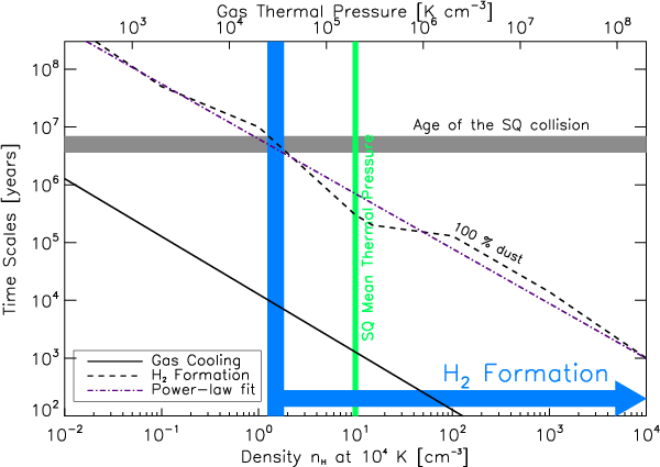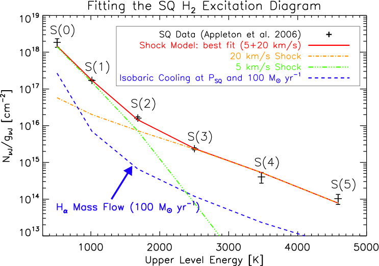 (i) H2 formation. The detection of large quantities of warm molecular gas in the SQ shock, coexisting with an X-ray emitting plasma, is a surprising result. Appleton et al. (2006) invoked an oblique shock geometry, which would reduce the shock strength. However, with this hypothesis, it is hard to explain why the temperature of the postshock plasma is so high (5