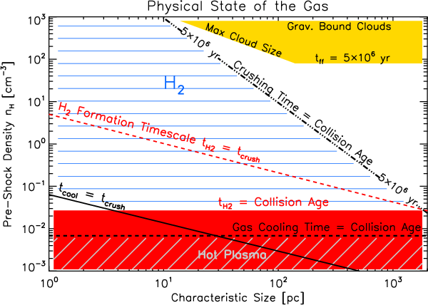 Results. (i) The shock velocity, the post-shock temperature and the gas cooling timescale depend on the preshock gas density. The collision velocity is the shock velocity in the low density volume-filling intercloud gas. This produces a