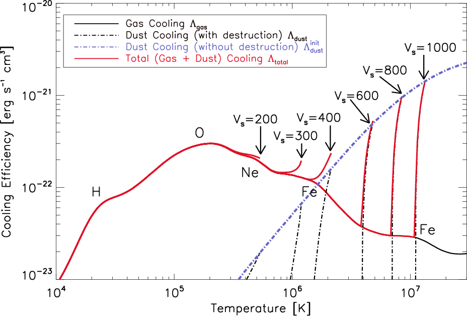 K. During the gas cooling, we calculate how much the grains are eroded and deduce the mass fraction of dust that remains in the cooling gas as a function of the temperature. The total cooling function (red curves in Fig. B.1) is deduced by summing the gas and dust cooling rates. We show different cooling efficiencies for different initial temperatures, corresponding to different shock velocities.