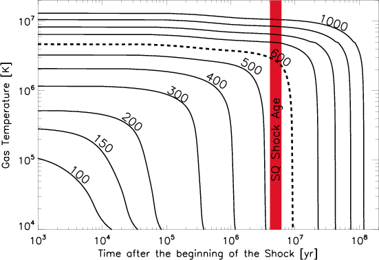 Evolution of the gas temperature with time at constant pressure, from the postshock temperature to 104 K for different shock velocities (indicated on the curves in km s-1). The dashed line is for