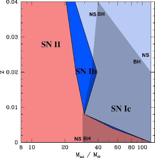 Figure 1: Ranges of masses of different types of supernova progenitors at different metallicities. For each area, the type of progenitor is indicated in the figure (see text). The shading on the right indicates the area where formation of a black hole (BH) is expected; elsewhere, the remnant is a neutron star (NS) (color figure available online). |