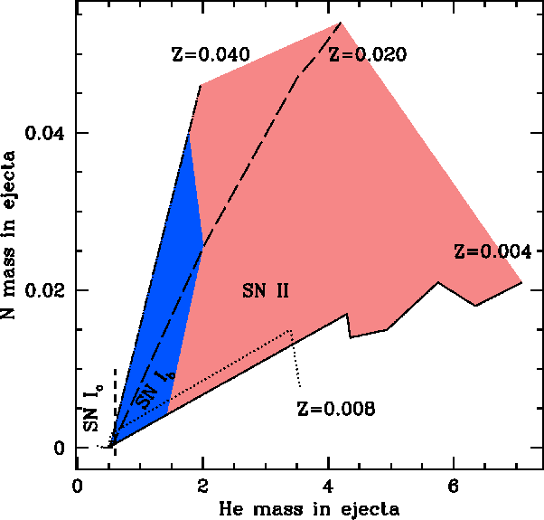The SN II region (red) and SN Ib region (blue) are represented, as well as the SN Ic region (on the left of the short dashed line). Masses are given in |