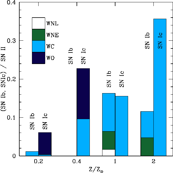 In this context, a very interesting feature observed by Prantzos & Boissier (2003) is the increase with the metallicity in the number fraction of type Ibc to type II supernovae. Such a trend is reproduced well by rotating single-star models accounting for metallicity-dependent stellar winds (Meynet & Maeder 2003). On the other hand, a well known scenario explaining this trend comes from close binary-star evolution (see for example Vanbeveren et al. 2007; Eldridge et al. 2008; Podsiadlowski et al. 1992). In this scenario, the hydrogen-rich envelope is removed either through a Roche lobe overflow process or during a common envelope phase, producing a WR star.