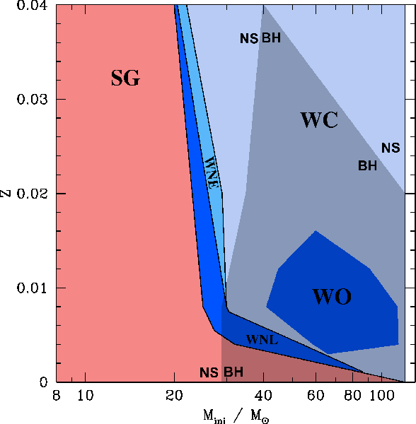 - all the stars not ending their lifetime as a Wolf-Rayet star end their nuclear life as a blue or a red supergiant. They are hereafter called supergiant (SG);