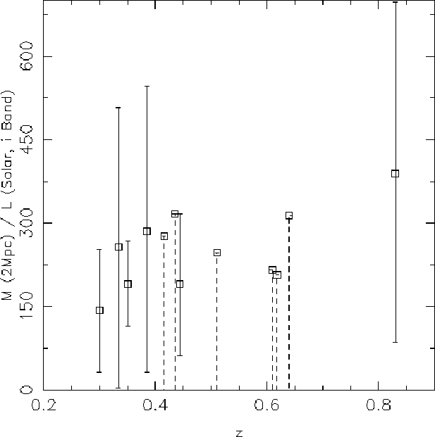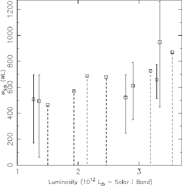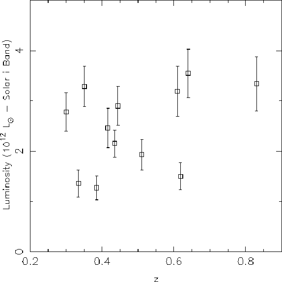 Figure 3: Luminosities (corrected for passive evolution) versus group redshifts. |