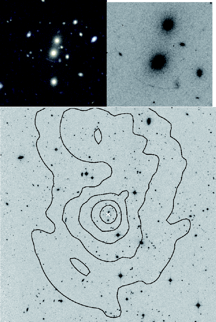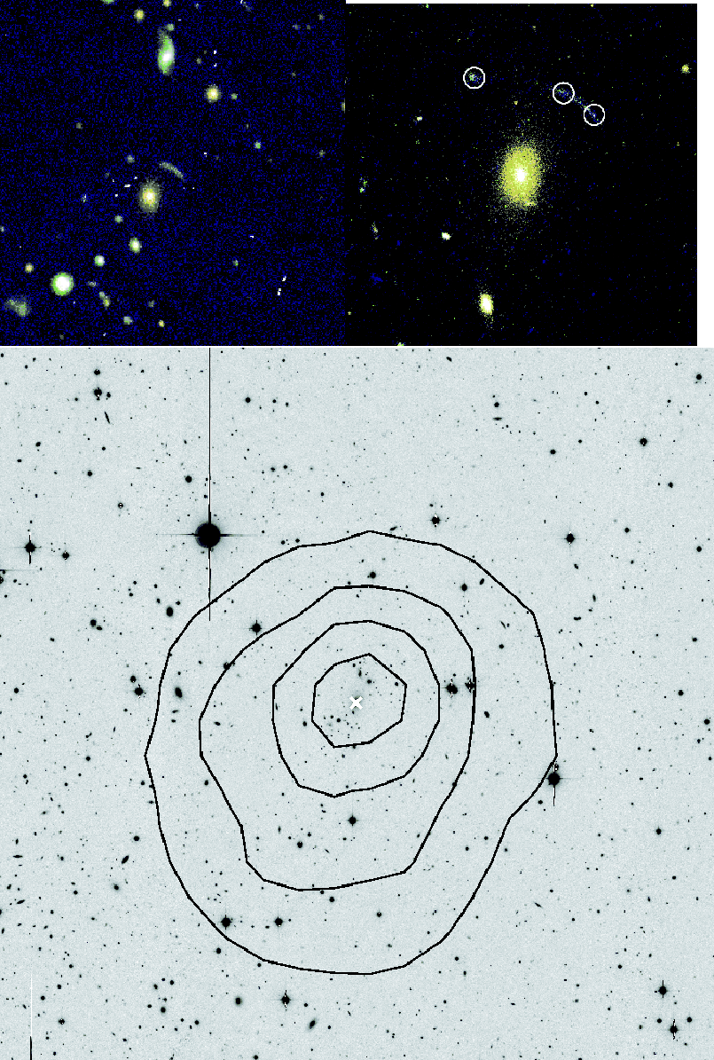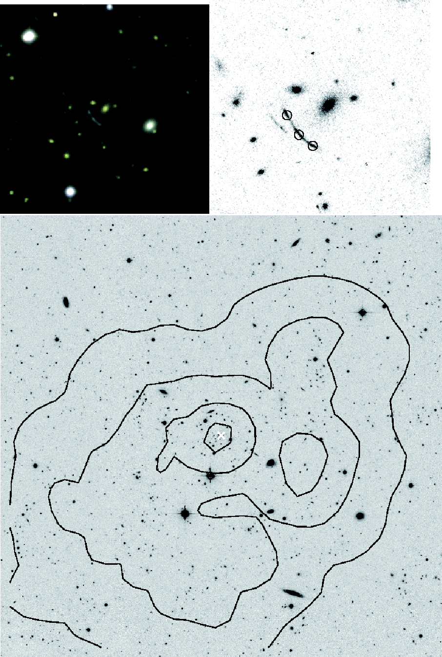 The luminosity distribution is elongated in the south-east north-west direction. A small tangential arc is found around bright galaxies. We cannot conjugate any images that may merge to form the arc. It is possible that this blue lensed feature in fact is singly imaged.