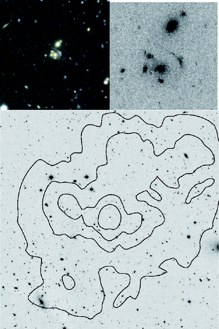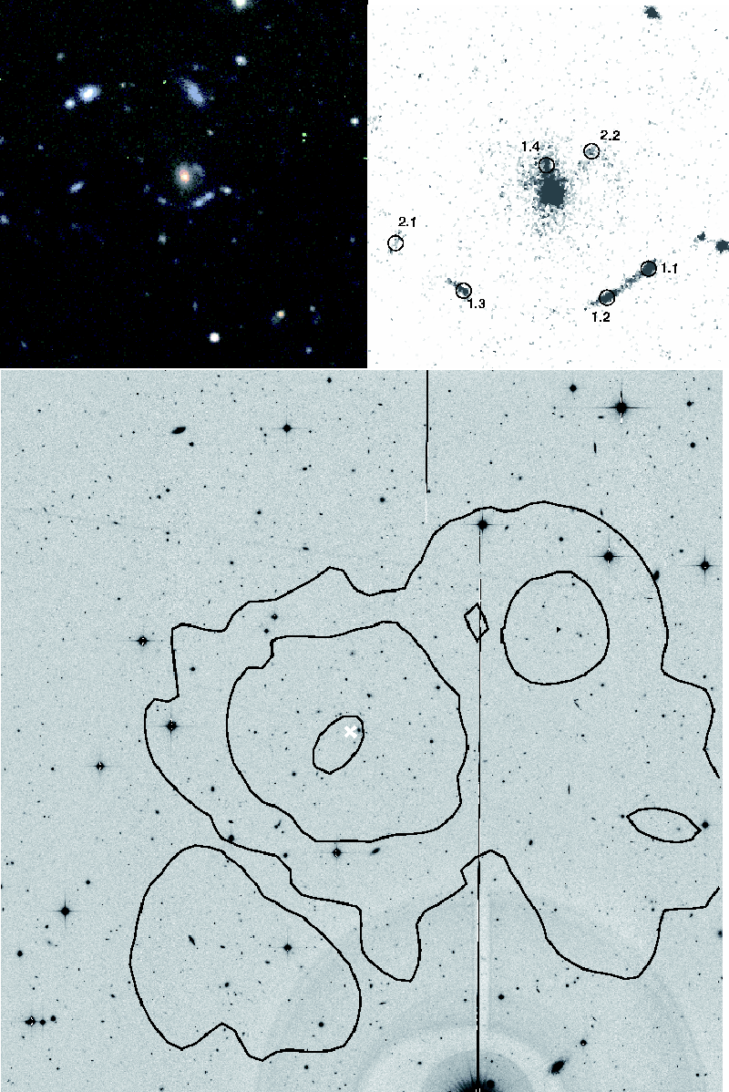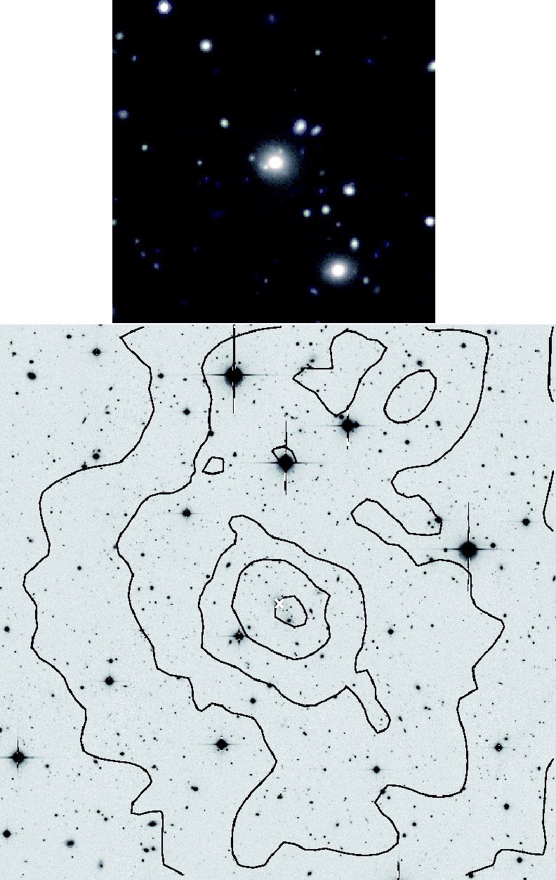 The luminosity distribution is elongated in the south-east north-west direction. A small tangential arc is found around bright galaxies. We cannot conjugate any images that may merge to form the arc. It is possible that this blue lensed feature in fact is singly imaged.