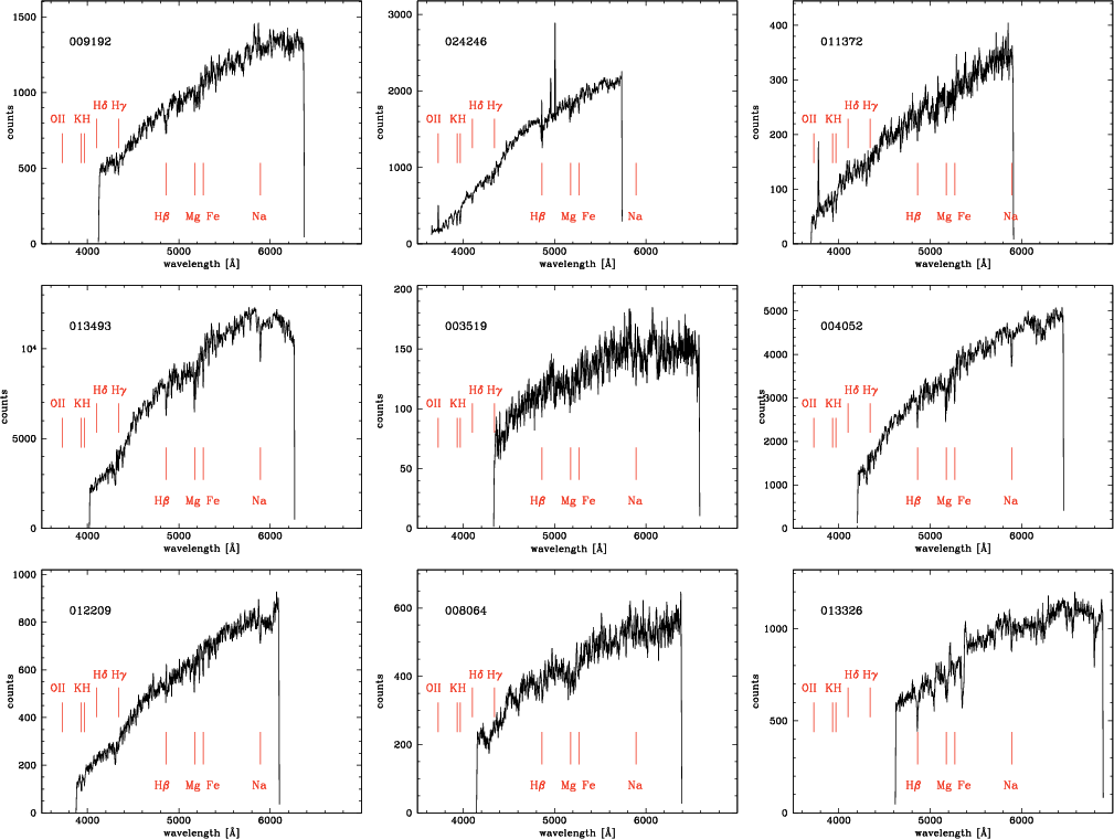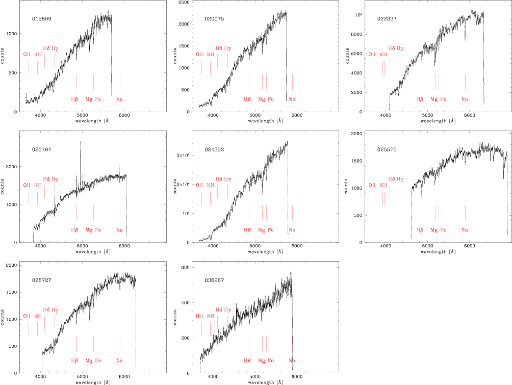 Spectroscopic observations were tailored to derive both the candidate-galaxy redshift and, in a subsequent study, the absorption line-strength indices of member galaxies to investigate their average age and metallicity and infer their star-formation history (see e.g., Grützbauch et al. 2005). We adopted the HR (high resolution) blue grism, which permits the coverage of the spectral region containing the H,