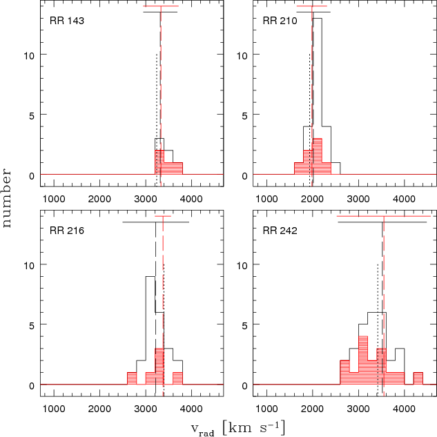 130 000 km s-1 is plotted in the small window in the upper right corner of each group panel. Galaxies belonging to each group are shaded in red. To show the group structure in greater detail, we included the already known group members inside the WFI field of view in each histogram. RR 143 (top left panel) and RR 210 (top right panel) show prominent concentrations at