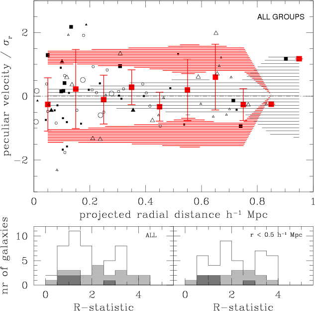 Analysis of galaxy offsets in projection and velocity. Upper panel: peculiar galaxy velocities (