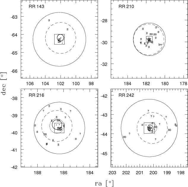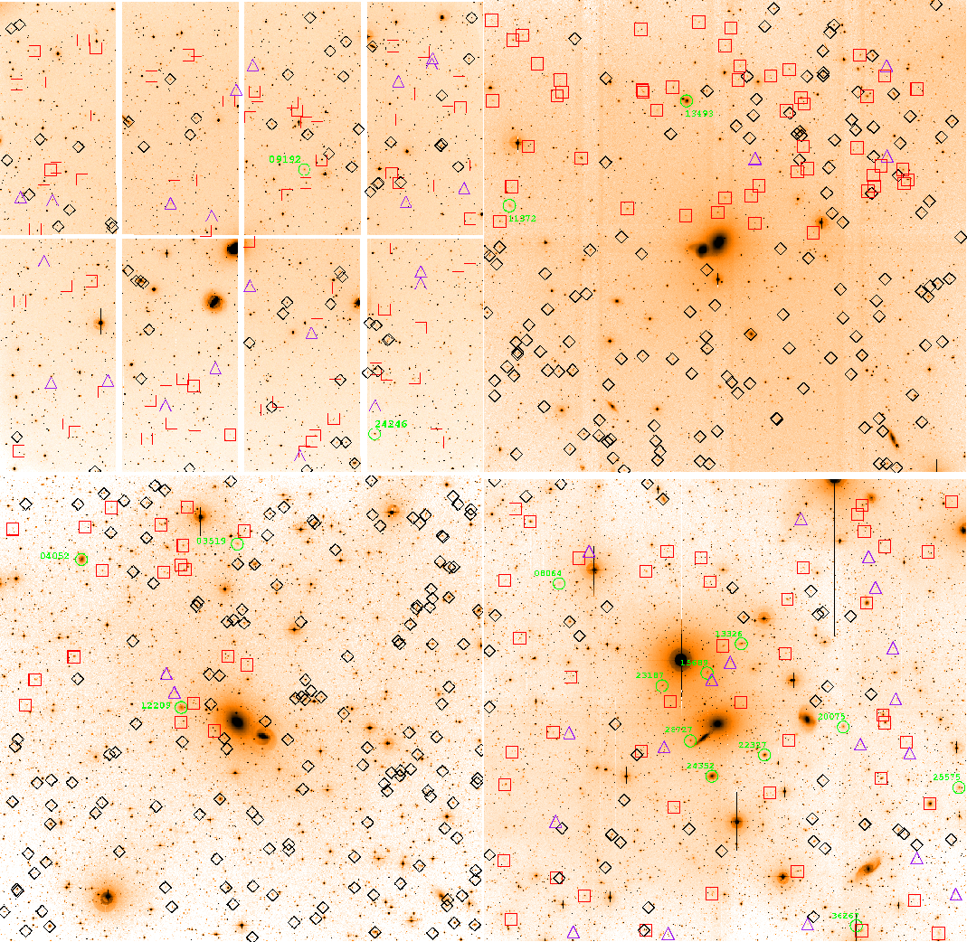 Figure 1: Results of VIMOS observations superposed on the WFI images: RR 143 ( top left), RR 210 ( top right), RR 216 ( bottom left), and RR 242 ( bottom right). Each field is centred on the bright E galaxy of the pair. Due to an error in the service-mode observations, the field of RR 143 was not dithered and thus shows the gaps between the single CCDs. Each WFI field was covered by 4 VIMOS pointings, one for each quadrant of the WFI field of view. However, not all four quadrants were observed for each group, due to incomplete service-mode observations. Marked with different symbols are: new group members (green circles), confirmed background galaxies (red squares), spectroscopically observed candidates too faint for redshift measurement (blue triangles), and spectroscopically non-observed objects (black diamonds). The newly identified group members are also labelled with their object ID (see Table 3). The different spectroscopic coverage of each field can be seen, since the not-covered quadrants only contain black diamonds. |