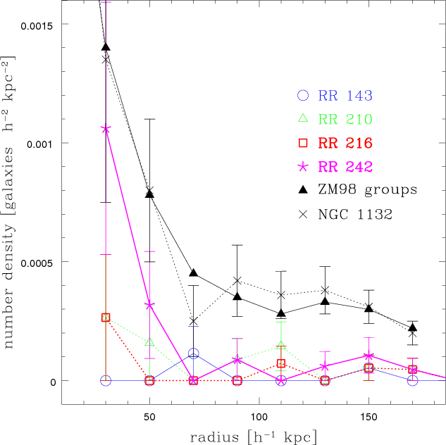 h100-1 kpc). RR 210 and RR 216 show relatively faint and compact (i.e., within the optical galaxy) X-ray emission, consistent with an origin in an evolved stellar population. The emission in RR 143 and RR 242 can be argued to be related to a group potential (as in CPG127) rather than to an individual galaxy. In such a scenario, RR 210 and RR 216 could represent the active part of very poor and loose evolving groups (see e.g., Rampazzo et al. 2006). The activity is reflected by the optically extended and distorted morphologies (see Paper III).