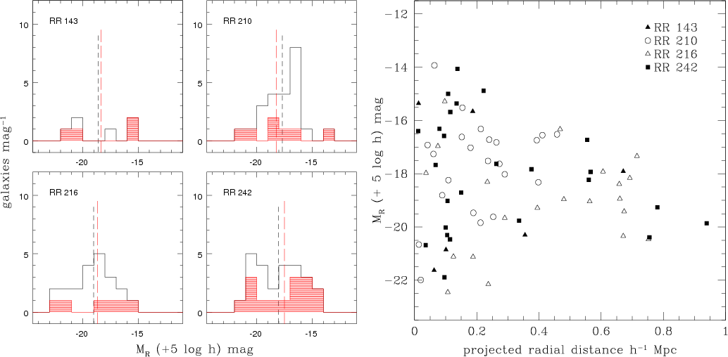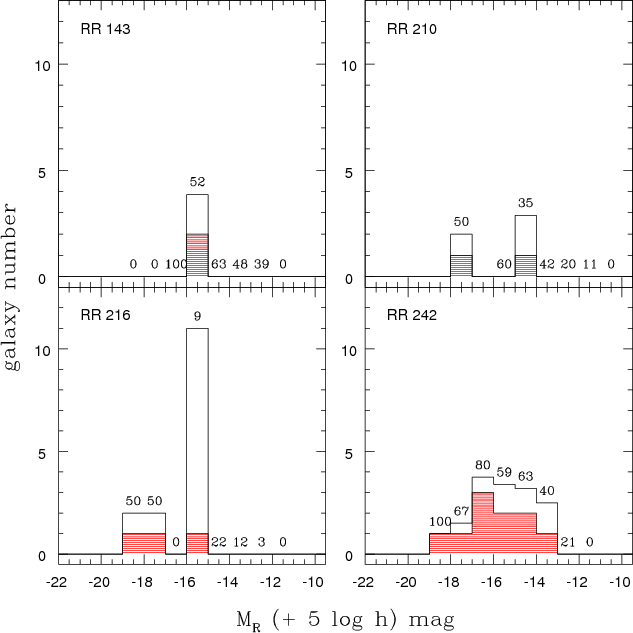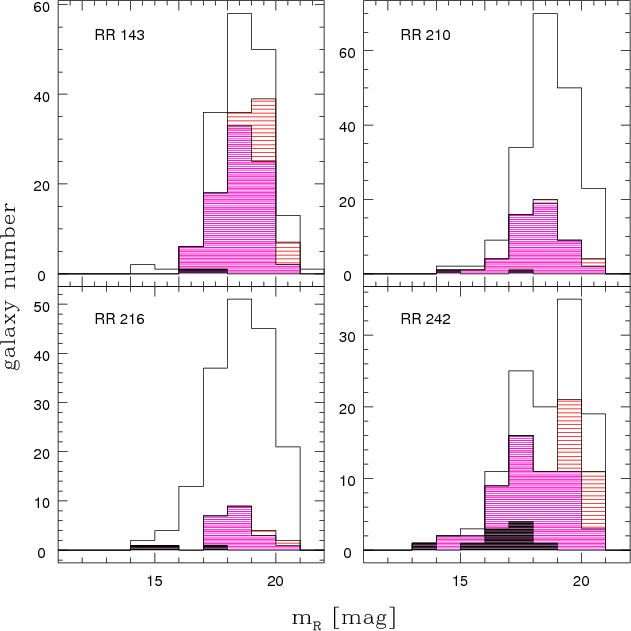 Figure 3: Distribution of R-band magnitudes in all 4 group samples: RR 143 ( top left), RR 210 ( top right), RR216 ( bottom left) and RR 242 ( bottom right). The different histograms show the full candidate sample (unshaded), spectroscopically observed galaxies (red, mildly shaded), galaxies with measured redshift (magenta, shaded), and new member galaxies (black, heavily-shaded). They correspond to the samples given in lines 1, 2, 5, and 6 in Table 2. The bin size is 1 mag. |