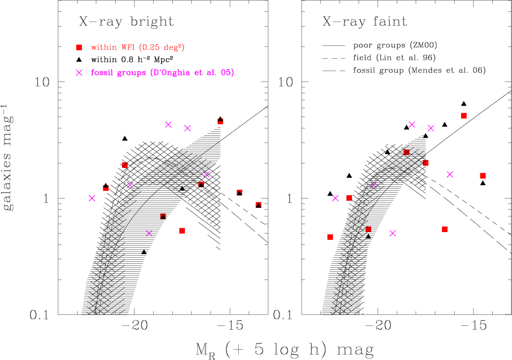 The X-ray signature of a hot intra-group medium (IGM) has been detected in loose groups containing an early-type galaxy population (e.g., Mulchaey 2000). The pioneering work of Zabludoff (1999) suggested that groups might fall into different classes defined by their X-ray properties: from groups with a luminous, extended, hot IGM centred on a giant E to groups with little or no diffuse emission. Several examples of these classes can now be found in the literature (see e.g., Ota et al. 2004; Trinchieri et al. 2003; Mulchaey et al. 2003; Belsole et al. 2003). In a hierarchical evolutionary scenario, the final product of a merged group would be a luminous isolated E with an extended X-ray halo, and a few have indeed been identified (see e.g., Khosroshahi et al. 2004; Jones et al. 2003; Mulchaey & Zabludoff 1999; Vikhlinin et al. 1999). Jones et al. (2003) estimated the incidence of fossil groups. They found that fossil systems, defined as a spatially extended X-ray source with an X-ray luminosity from diffuse, hot gas of
