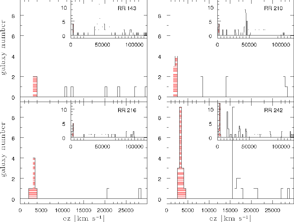 Figure 2 shows the distribution of measured radial velocities for each field. Each group panel shows the velocity range up to 30 000 km s-1 (10 times the group velocity), whereas the full range of velocities found up to