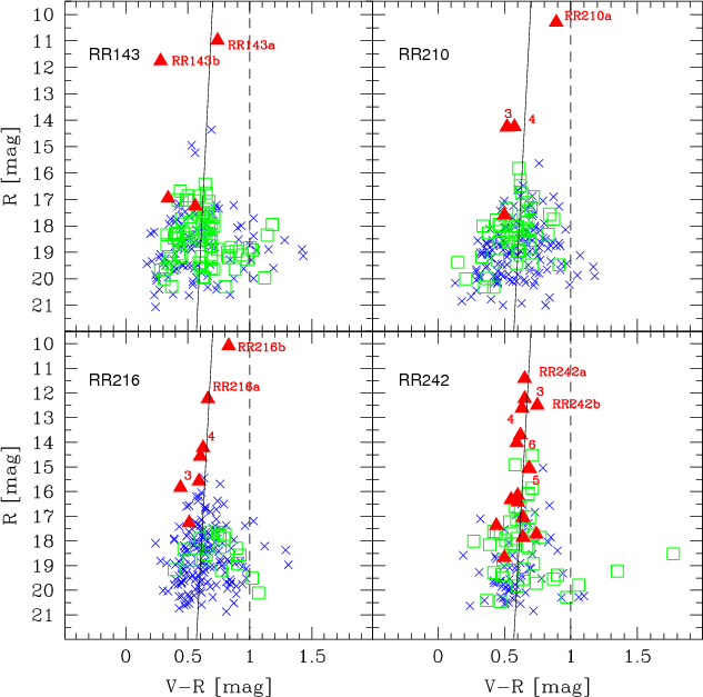 of the total area (the 4 WFI fields) was observed with VIMOS. Additionally, the incompleteness differed between the 4 fields with RR 143 and RR 242 being covered completely, while for RR 210 and RR 216 only 50% and 25%, respectively, of their fields were covered.