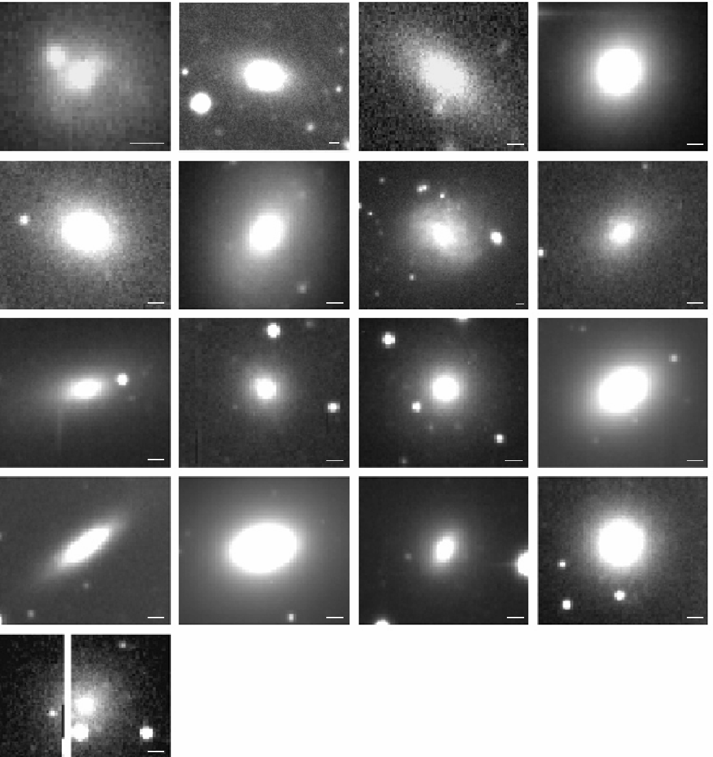Figure 6: R-band thumbnails of member galaxies of all 4 groups. From left to right: 1st row from the top: RR143_09192, RR143_24246, RR210_11372, and RR210_13493; 2nd row: RR216_03519, RR216_04052, RR216_12209, and RR242_08064; 3rd row: RR242_13326, RR242_15689, RR242_20075, and RR242_22327; 4th row: RR242_23187, RR242_24352, RR242_25575, and RR242_28727; last row: RR242_36267. The scale bar has a length of 2 arcsec in each image. |