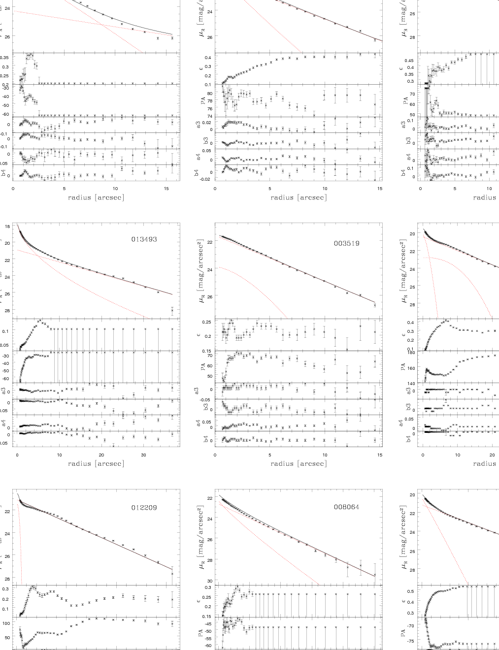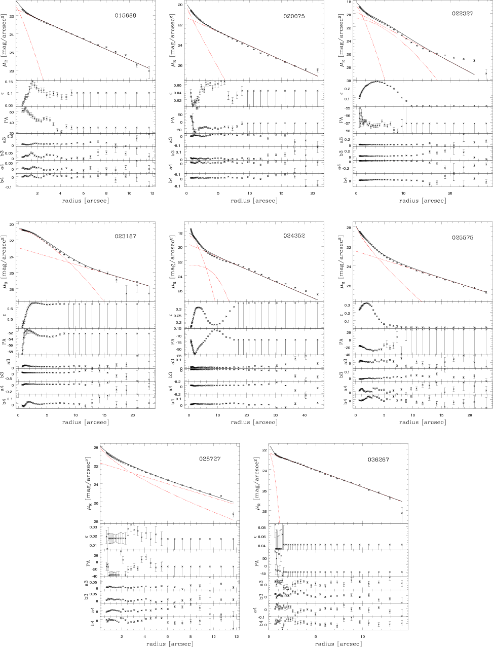 Figure 8: Surface photometry. The radial profiles of surface brightness, ellipticity, position angle, and higher order coefficients of the Fourier expansion a3, b3, a4, b4 of faint member galaxies in the R-band obtained by ELLIPSE. Each successive isophote is plotted as a small cross, the error bars are the errors given by ELLIPSE. The surface-brightness panel ( top panel in each plot) also shows the profile of the 2-component model obtained from GALFIT. The bulge and disk components are plotted as red dotted lines. If a third component (bar) improved the fit, it is also plotted. The total 2 (or 3) component galaxy model is then plotted as solid black line. Objects shown are RR143_09192, RR143_24246, RR210_11372, RR210_13493, RR216_03519, RR216_04052, RR216_12209, RR242_08064, and RR242_13326. |