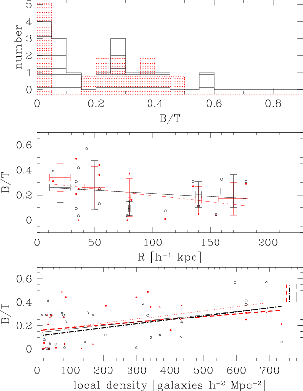 Figure 10: Bulge-to-total light ratios (B/T) of member galaxies of the 4 groups. Black and open symbols indicate B/T obtained from fitting a Sersic bulge, red and solid symbols indicate the de Vaucouleurs bulge. Top: histogram of B/T ratios for the fit with Sersic bulges (solid black line) and de Vaucouleurs bulges (red dotted line). Centre: B/T versus radius from the pair elliptical. Lines are least squares fits to the data (black solid - Sersic: red dashed - de Vaucouleurs). Bottom: B/T versus local projected density. Values are computed with the closest 5 galaxies (d5, circles) and the closest 3 galaxies (d3, triangles). Lines are least squares fits to d5 (dashed-dotted - Sersic; red dashed - de Vaucouleurs) and d3 (long-dashed - Sersic; red short-dashed - de Vaucouleurs). The vertical lines in the upper right corner represent the rms scatter of each fit. |
