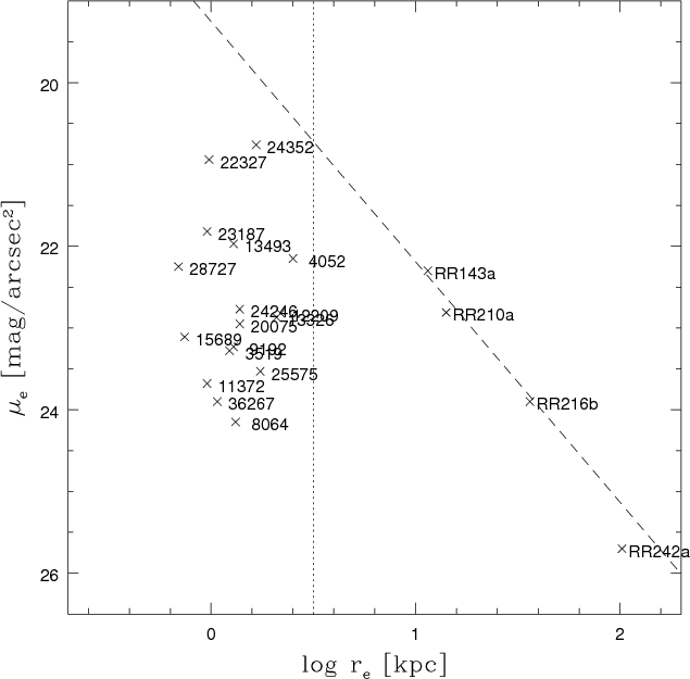 in all images (see Table 4 in Paper III). The detection size a given by SExtractor is not directly related to the galaxy's effective radius or the FWHM, but it gives the semi-major axis length of the detection ellipse, which is most likely larger than the galaxy's effective radius (which contains only half of the light). To ensure that we selected galaxies with effective radii larger than the area affected by the seeing, we chose a generous detection size limit of