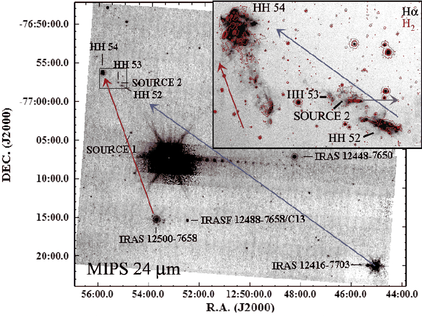Finally, the exciting sources of the HHs still remain unclear, even after a proper motion analysis of the infrared knots (Caratti o Garatti et al. 2006), the publication of MIPS maps and YSO catalogues for this region (Young et al. 2005; Porras et al. 2007; Alcalá et al. 2008).