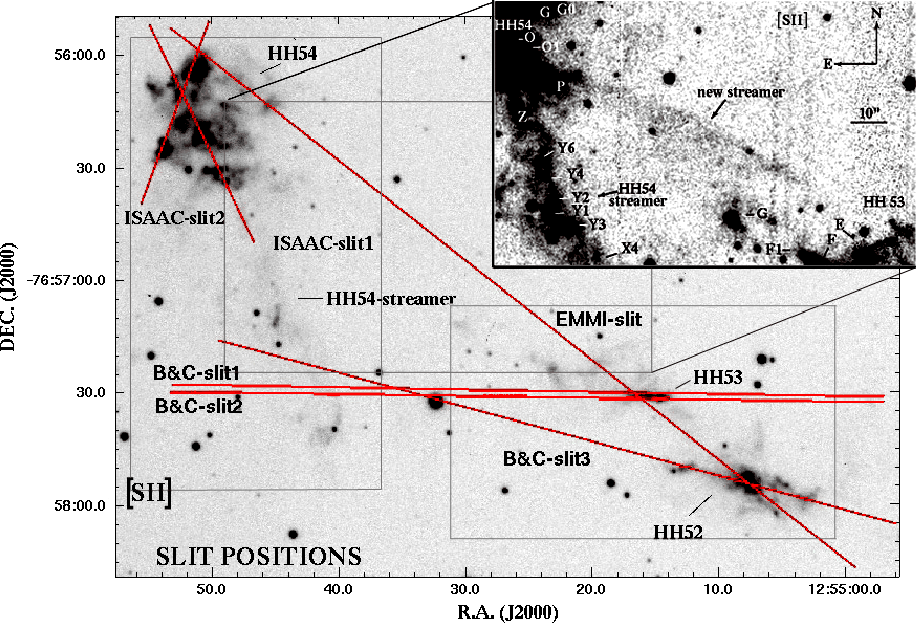 Figure 1: [S II] EMMI 2006 image of the region indicates the locations of the HH objects, along with EMMI, B&C, and ISAAC slit positions. In the upper-right inset [S II] deep image (from 1993) we show the newly detected HH 52 streamer. A rectangular box (in the centre of the image) shows its exact location. Additionally, left and right boxes approximatively indicate the fields displayed in Figs. 4-6. |