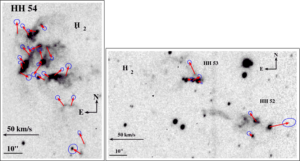 Upper figure: changes of proper motions ( bottom panel) and directions ( top panel) in HH 54 G (triangles) and G0 (circles) with time. Open and filled marks indicate measurements from H |