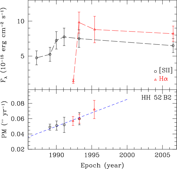 Variability in HH 52 B2. Bottom panel shows the PMs as a function of time in [S II] (circles)and H |
