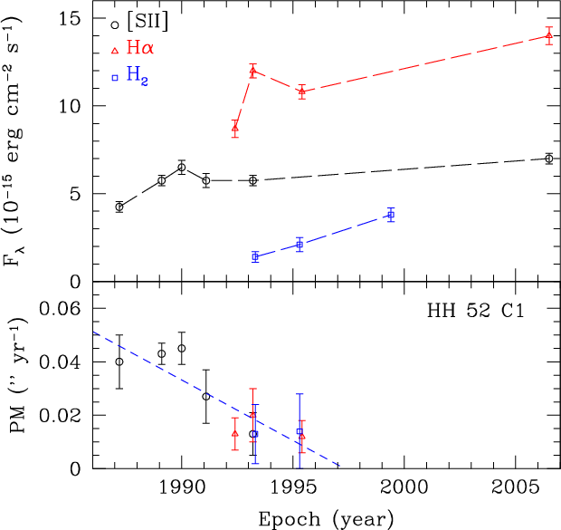 Variability in HH 52 C1. Bottom panel shows the PMs as a function of time in [S II] (circles)and H |