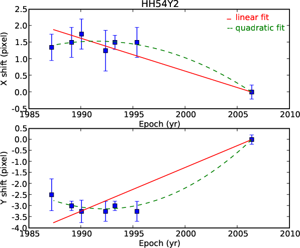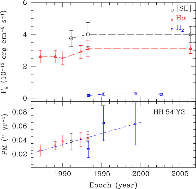Variability in HH 54 Y2. Bottom panel shows the PMs as a function of time in [S II] (circles), H |