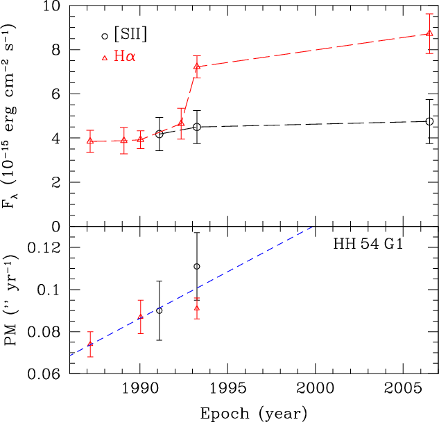 Variability in HH 54 G1. Bottom panel shows the PMs as a function of time in [S II] (circles) and H |
