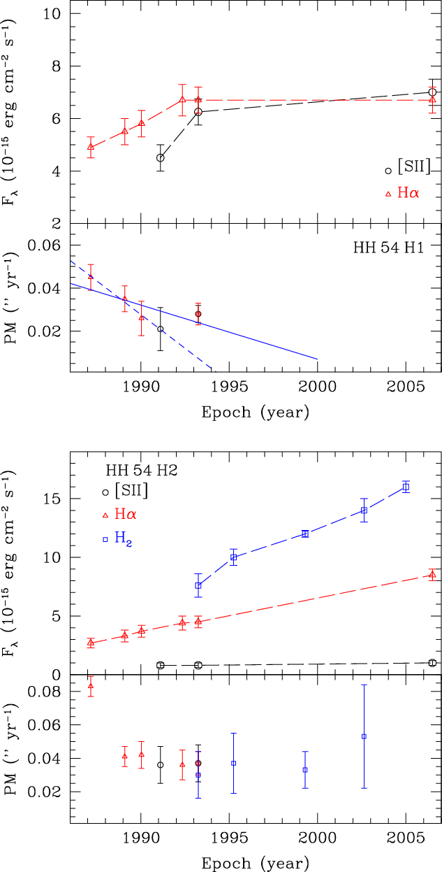 Variability in HH 54 H1 upper Figure and H2 bottom Figure The bottom panels show the PMs as a function of time in both [S II] (circles) and H |